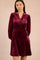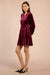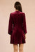 This short velvet dress features long sleeves and charming gathers at the shoulders. It boasts a wrap design with a wide, crossed V-neckline and a playful tie detail on the side.