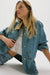 Features: Comfy denim fabrication, contrasting canvas collar, asymmetrical pockets, drop-shoulder sleeve, button-front closure, button-cuffs